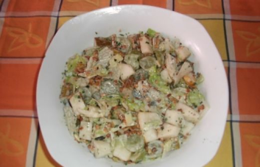 Zutaten für Personen Bild einstellen 250 g Gouda 45 % Fett i. TR. 1 Birne 200 g Weintrauben 1 EL gehackte Mandeln 0.5 Eisbergsalat 200 g Mayonnaise 2 EL gehackte Kräuter Rezept Zubereitung Käsesalat [...]