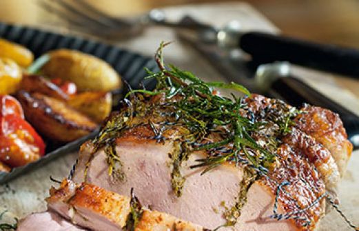 Schweinebraten mit Kräutern und Ofengemüse Zutaten 1,4 kg Schweinerücken (ohne Knochen, Kotelettbraten) 10 große Zweige Rosmarin 1 Bu [...]