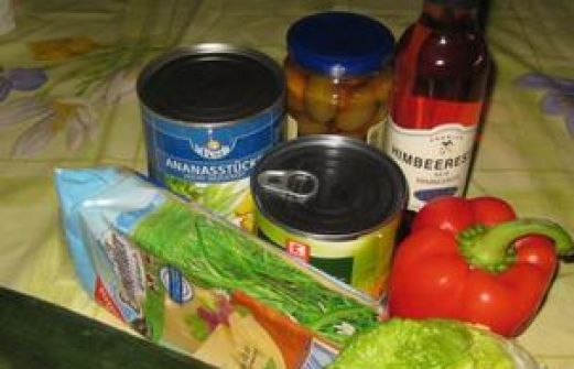 100 gGouda ½ DoseMais1 kleine Dose Ananas150 gSchinken6 Oliven12 Kapernäpfel1 rote Paprika ½Salatgurke1 kleines S [...]