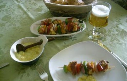 Rezept mit Bild: Fruchtige Hähnchenspieße mit Apfel-Curry-Dip