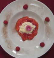 0.25 -Honigmelone0.5 -Charentais-Melone2 TLRosenwasser175 gkleine erdbeeren,gewaschenund geputzt -Rosenblütenblätter,zumGarnieren