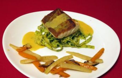 Nudeln300 gPastamehl200 gHartweizengrieß1 TLSalz2 StückEier3 StückEigelb125 gButter1 BundKorianderMaracujasauce1 StückSchalotte1 ELButter200 mlDessertwein100 mlWeiß [...]