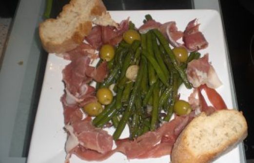 400 ggrüne Bohnen1 Knoblauchzehe2 Zwiebeln rot und weiß10 grüne oder schwarze Oliven Limetten-Olivenöl 1 Z [...]