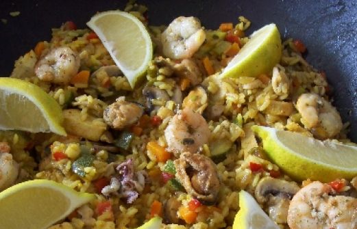 Paella ala Bine Zutaten 1 Stück rote Paprika 1 Stück grüne Paprika 1 Stück gelbe Paprika 1 Stück Zwiebel 4 Stück Knoblauchzehen 150 Gramm Erbsen 2 Stück Karotten 1 Stück Zuccini 250 Gramm tiefgefrorene Meeresfrüchte 250 Gramm riesen Garnelen 300 Gramm Hühnerbrust 200 Gramm Rei [...]