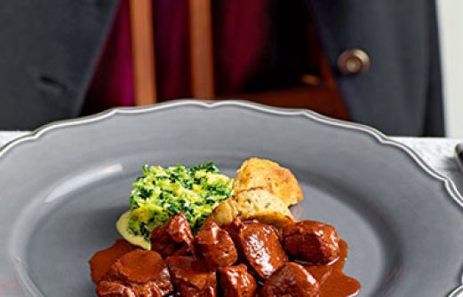Wildschweingulasch Zutaten 1 große Zwiebel 1 Knoblauchzehe 1 kleine Möhre 1 Stück Knolensellerie (ca. 80 g) 1 Petersilienwurzel 3 Zweige Thymian 1,2 kg Wildschweinschulter Salz schwarzer Pfeffer aus der Mühle 1 TL gemahlenes Wildgewürz 3 gute Prisen Mehl 3 EL Pflanzenö [...]