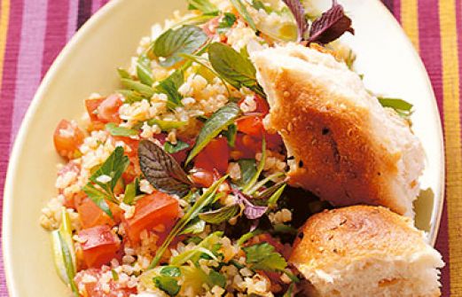 Tabouleh Zutaten 125 g feiner Bulgur (vorgegarter Hartweizengrieß) Salz 350 g reife Tomaten 300 g Petersilie (ca. 4 Bund) 4 Frühlingszwiebeln 2 frische grüne Chilischoten 2 Knoblauchzehen Pfeffer 1 EL Sumak (säuerliches Pulver aus Essigbaumfrüchten; ersatzweise Tomatenmark [...]