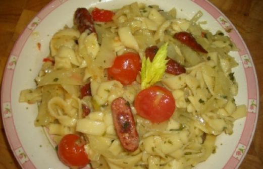 Zutaten für Personen Bild einstellen 1 Gemüsezwiebel 2 Peperoni grün 200 g Kabanossi 0.5 Weißkohl frisch 2 EL Öl 1 EL Gemüsebrühe-Pulver 400 g Tagliatelle Salz Pfeffer aus der Mühle, schwarz 200 g Kirscht [...]