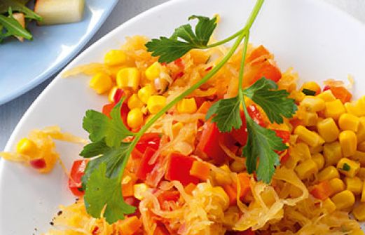Maissalat mit Sauerkraut Zutaten 50 ml Orangensaft 2 EL Weißweinessig 1 kleine Karotte 1 kleine rote Paprikaschote 1 kleine rote Zwiebel 2 EL Olivenöl 140 g Maiskörner (aus der Dose) 100 g Sauerkraut Jodsalz Pfeffer 1/2 Bund Petersilie 50 ml Orangensaft , 2 [...]