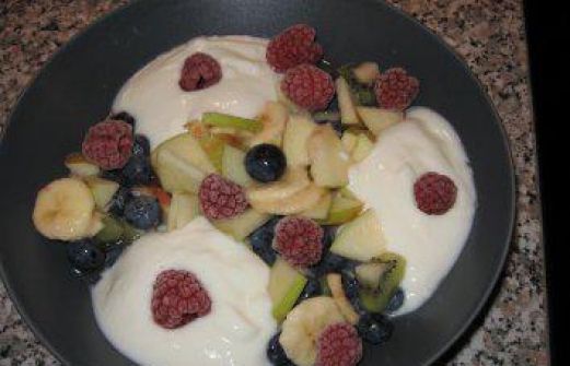 Zutaten für Personen Rezept mit Bild: Obstsalat mit Joghurt-Kokoscreme Bild einstellen 1 Banane 1 Apfel 1 Kiwi 125 g Heidelbeeren 1 Zitrone 2 Handvoll Himbeeren, ich nahm TK 300 g Joghurt 2 Eßl [...]