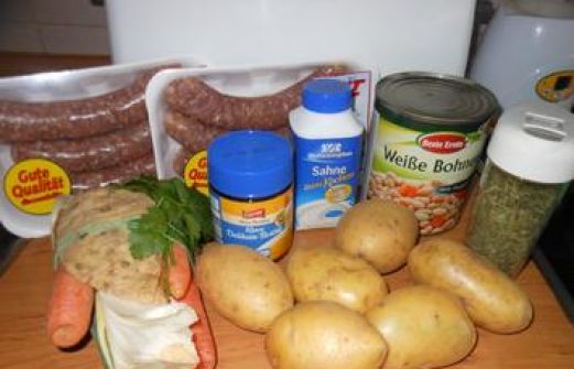 Zutaten für Personen Rezept mit Bild: Hackbällchen - Eintopf mit Gemüsse Bild einstellen 2 Stk. Zwiebeln frisch 1.2 kg Kartoffel 1 mal Suppengrün frisch 1 Dose weiße Bohnen - 425 g Abtropfgewicht 1 EL Butt [...]