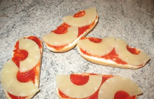 Menge Zutat 2 St Baquettebrötchen zum Fertigbacken 4 Schb Ananas 3 EL Tomatenketchup 8 Schb Emmentaler Die Baquettebrötchen aus der Verpackung nehmen. Ofen [...]