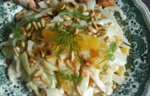 Zutaten für Personen Rezept mit Bild: Fenchelsalat mit Pinienkerne Bild einstellen 300 g Fenchel 150 g Orange frisch 30 ml Weinessig 0.5 Zehe Knoblauch 60 g Naturjoghurt 20 g Pinienkerne frisch 1 [...]