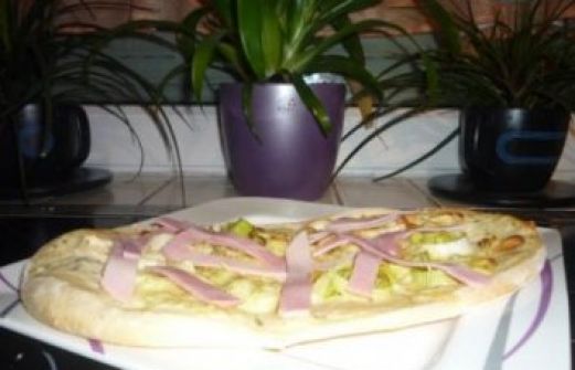 Zutaten für Personen Rezept mit Bild: Flammkuchen Porree- Schinken Bild einstellen 0.5 Pk. Hefe 1 TL Zucker 500 gr. Mehl 5 EL Öl Salz Pfeffer 100 gr. Saure Sahne 100 gr. Crème fraîche mit K [...]