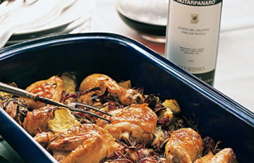Hühnchen mit Artischocken Zutaten 1 küchenfertiges Brathähnchen (ca. 1,2 kg) 2 Bio-Zitronen Salz Pfeffer 4 EL Olivenöl 8 kleine Artischocken 2 rote Zwiebeln 2 Knoblauchzehen 4 Zweige Rosmarin 1/8 l trockener Weißwein 1 küchenfertiges Brathähnchen (ca. 1,2 kg) , [...]