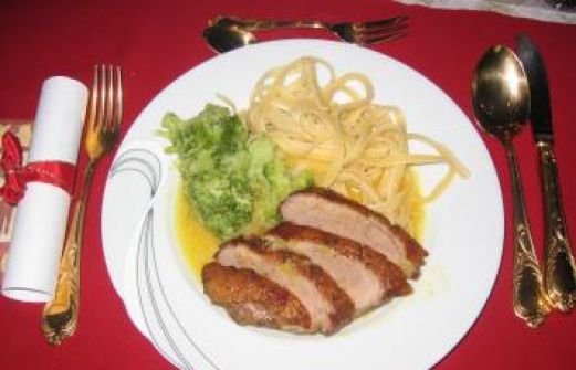 Zutaten für Personen Rezept mit Bild: Entenbrust mit Ingwer- Orangensauce Bild einstellen 2 Stück Barbarieentenbrust 1 Stück Ingwer frisch 3 EL Orangengelee "winterliches" 300 ml Orangensaft 1 Schuss Orang [...]