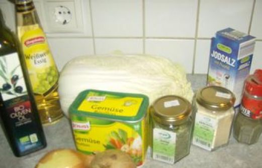 Zutaten für Personen Rezept mit Bild: Chinakohlsalat Bild einstellen 1 Chinakohl 2 Zwiebeln 5 Zehen Knoblauch fein gehackt Fürs Dressing: 400 ml Gemüsebrühe 4 Eßl Olivenöl 4 Eßl Weißwein Essig [...]