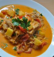 Zutaten für Personen Rezept mit Bild: Thai-Curry mit Hühnchen Bild einstellen Reste von gebratenem Hähnchen 1 Dose Kokosmilch 1 grüne und rote Paprikaschote 1 große Karotte Salz, Pfeffer, Curry, Chinagew [...]
