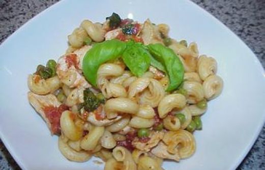 Zutaten für Personen Bild einstellen 200 gr. Hähnchenfilets 1 mittelgroßeZwiebel 1 Knoblauchzehe 2 Stiele frischer Basilikum 100 gr Nudeln Salz, Pfeffer 4 EL TK-Erbsen 400 gr stückige Dosentomaten 1 TL Hühnerb [...]