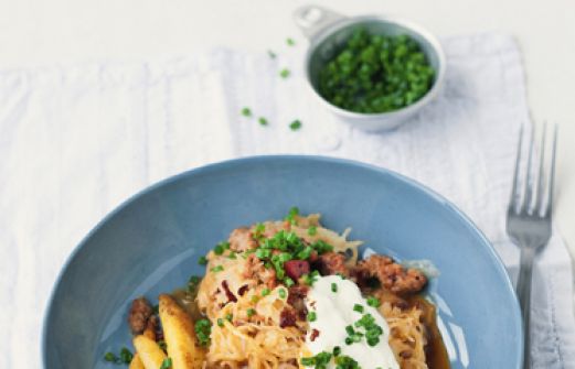 Sauerkraut-Hack-Gulasch mit Schupfnudeln Zutaten 500 g mehligkochende Kartoffeln 2 Zwiebeln 75 g Kabanossi 250 g gemischtes Hackfleisch 2 EL Öl Salz Pfeffer edelsüßes Paprikapulver 500 g Sauerkraut (vakuumverpackt) 100 ml Weißwein (oder Apfelsaft) 300 ml Apfelsaft 2 EL Zuck [...]