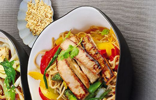 Soba-Thunfisch-Wok Zutaten 400 g Thunfischfilet 100 ml Teriyaki-Sauce 2 TL Speisestärke 1 TL Wasabi-Paste 250 g Soba-Nudeln 250 g grüner Spargel Salz 1 je rote und gelbe Paprikaschote 3 Frühlingszwiebeln 2 EL Öl 1 EL Sesamöl Pfeffer 100 ml Fischfond (aus dem Glas) 1/2 B [...]