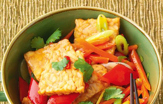 Wokgemüse mit Tempeh Zutaten 1 rote Paprikaschote 1 dicke Möhre 1 Bund Frühlingszwiebeln 2 Knoblauchzehen ½ Bio-Zitrone 1 rote Chilischote 500 g Tempeh 4 EL Öl 150 ml Gemüsebrühe 1 TL flüssiger Honig Salz Koriander- oder Basilikumblättchen zum Bestreuen 1 rote P [...]