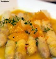 Zutaten für Personen Bild einstellen 8 Stück Hähnchenkeulen 4 EL Olivenöl 4 Zwiebeln rot 1 EL Mehl 150 ml Weißwein trocken 200 ml Hühnerbrühe 3 Thymianzweige 20 Stangen grünen Spargel 30 g Butter 1 Orange unbehandelt [...]