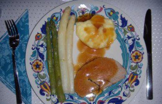 Zutaten für Personen Rezept mit Bild: Kalbsbraten von der Lende Bild einstellen 1 kg Kalbslende 1 Möhre 0.5 Stange Porree Stück Sellerieknolle 1 Zwiebel 125 ml Kalbsfond Salz, Pfeffer etwa [...]