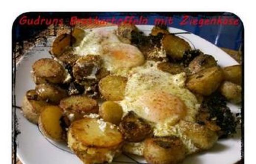 Zutaten für Personen Rezept mit Bild: Kartoffeln: Bratkartoffeln mit Ziegenkäse Bild einstellen 5 kleine Pellkartoffeln, in Scheiben geschnitten 4 kleine Ziegenkäsetaler 2 Eier aus der Freilandhaltung P [...]