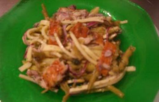 Zutaten für Personen Rezept mit Bild: Gemischter Bohnensalat mit geräucherter Makrele Bild einstellen 350 g Bohnen grün gegart 350 g Bohnen gelb gegart 200 g Makrelenfilet geräuchert 200 g Gouda 1 Zwi [...]