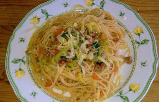 Zutaten für Personen Rezept mit Bild: Spaghetti Bolognese "Bayerisch" Bild einstellen 500 g Spaghetti 250 g Lauch/Porree 2 EL Butter 300 g Rinderhackfleisch 50 g geräuchertes Wammerl, geräucherter Bauchspe [...]