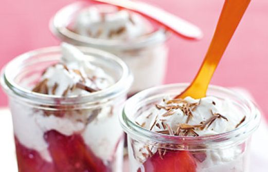 Pflaumen-Trifle Zutaten 500 g Pflaumen 50 g Zucker 250 ml roter Johannisbeersaft 1 Zimtstange 2 Gewürznelken 1 EL Vanillepuddingpulver 50 g Schokoraspel (Fertigprodukt) 250 g Mascarpone 250 g Quark 100 g Puderzucker 1 Päckchen Vanillezucker 250 g Sahne 2 dunkle Biskuitbö [...]