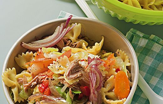 Gemüse-Farfalle mit Thunfisch Zutaten Salz 200 g Farfalle (Schmetterlingsnudeln) 1 Dose Thunfisch in Olivenöl (Abtropfgewicht 140 g) 1 rote Zwiebel 1 Knoblauchzehe 150 g Spitzkohl (oder junger Weißkohl) 1 kleine rote Paprikaschote 2 Möhren 2 EL Olivenöl schwarzer Pfeffer 1 [...]