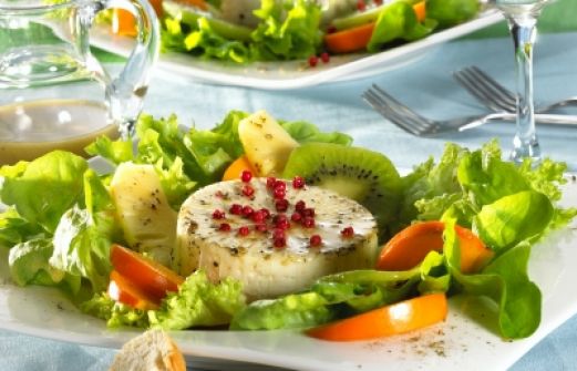 Menge Zutat 4 EL Honig 2 TL rote Pfefferkörner 4 St Ziegenfrischkäse (à ca. 125 g) 200 g Salat (z.B. Frisée, Romana) 200 g gemischte Früchte (z.B. Kiwi, Ananas [...]
