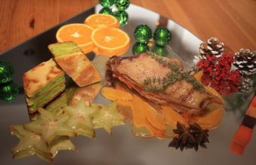 Zutaten für Personen Rezept mit Bild: Weihnachtliche Ente auf Orangenjus Kräuterbaumkuchen und Trilogie vom Gemüse Bild einstellen Ente 2 Kilogramm Ente ,ganz mit Haut frisch 1 Stück Orange geschnitten Rosma [...]