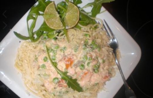 Zutaten für Personen Rezept mit Bild: Spaghetti in Lachskräutercreme Bild einstellen 2 Portionen Spaghetti 200 g Stremellachs 200 g grüne Erbsen tiefgekühlt 100 g Frischkäse mit Kräutern 1 Biozitrone 1 [...]