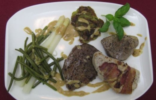 Zutaten für Personen Bild einstellen 5 Stk. Putenfiletmedaillons 5 Stk. Rindermedaillons 5 Stk. Schweinemedaillons 5 Scheibe Speck 1 TL Butter 1 Prise Salz 1 Prise Pfeffer 1 Schuss Chiliöl Pommes Macaires: [...]