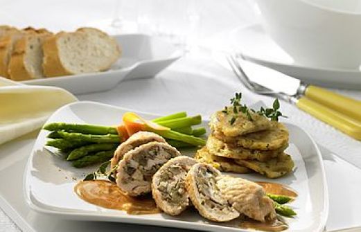 für 4 Personen Putenrouladen: 4 Stk dünne Putensteaks 100 g Maronen geschält 80 g Schinken (Putenschinken) 2 EL Butter 1 Stk weiße Zwiebel 2 Stk Eigelb 1/2 Bund Petersilie Salz und Pfeffer 2 Bund grüner Spargel Knödelblätter: 250 g altbackenes Brot 300 ml Milch 2 Stk Eier 70 g Butter 1/4 B [...]
