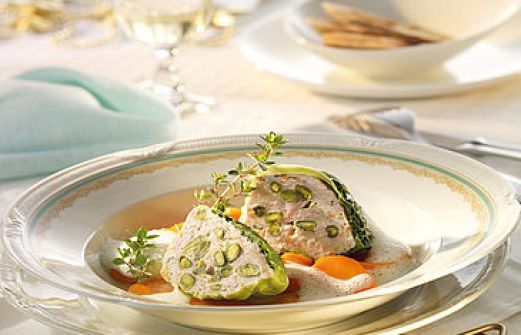 für 4 Personen 500 g Hähnchenbrust 4 EL Sahne Salz und Pfeffer aus der Mühle 70 g Pistazien 70 g Lauch 8 Stk Wirsingblätter etwas Butter 2 Stk Schalotten 2 EL Olivenöl 150 ml Weiswein 300 ml Geflügelfond 125 ml Crème fraîche Saft einer Zitrone 60 g kalte Butter 2 EL eingelegte grüne Pfefferkö [...]