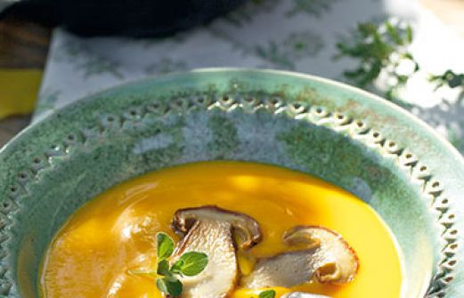 Kürbiscremesuppe mit gebratenen Steinpilzen Zutaten 800 g Kürbis (z. B. Hokkaido- oder Moschuskürbis, geputzt ca. 600 g) 1 kleine mehligkochende Kartoffel 1 große Zwiebel 4 EL Butter 200 ml lieblicher Cidre (ersatzweise Apfelmost) 1/2 l Gemüsebrühe Salz Pfeffer frisch gerie [...]