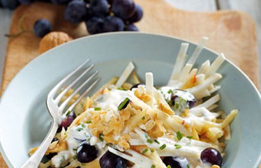 Selleriesalat mit Trauben und Nüssen Zutaten 600 g Knollensellerie 1 großer rotschaliger Apfel (z. B. Elstar) 1 EL frisch gepresster Zitronensaft 100 g blaue Weintrauben 80 g Walnusskerne 4 EL Crème fraîche 4 EL saure Sahne Salz Pfeffer Zucker 1/2 Bund Schnittlauch [...]
