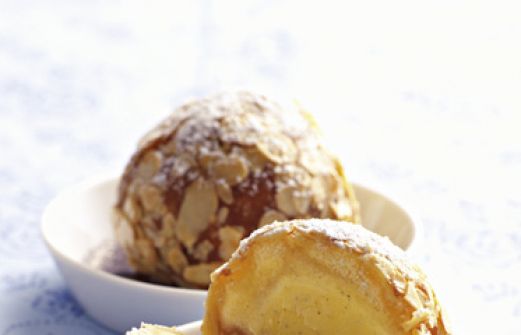 Gebackenes Vanilleeis mit Röstmandeln Zutaten 4 große Kugeln Vanilleeis (à 50 g) 2 Scheiben heller Wiener Tortenboden (à 200 g, Fertigprodukt aus dem Backregal) 8 EL Rum 2 Eier (Größe M) 100 g Mandelblättchen 1 kg Frittierfett Puderzucker zum Bestäuben Schokoladensauce zum Servier [...]