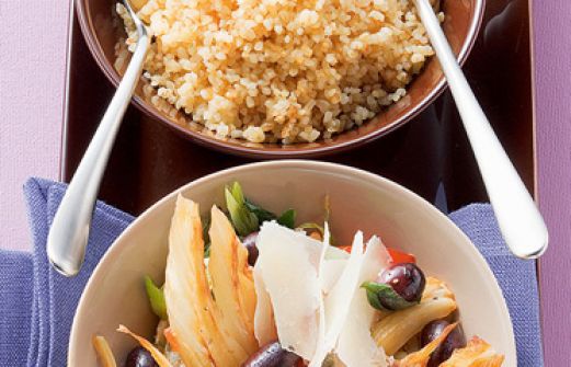Bulgur mit Fenchel und Käse Zutaten 150 g Bulgur 300 ml Gemüsebrühe 2 kleinere oder 1 große Fenchelknolle (ca. 400 g) 200 g Tomaten 2 Frühlingszwiebeln 2 Knoblauchzehen 3 EL Olivenöl 1/2 TL Fenchelsamen (nach Belieben) 2 EL Anisschnaps (Pastis; nach Belieben) 1 EL kleine sch [...]
