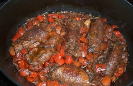 Zutaten für Personen Bild einstellen 6 Rinderrouladen aus der Oberschale, à ca. 200g 2 grosse Zwiebeln 3 grosse Gewürzgurken 3 rote Paprika 3 Möhren 10 Scheiben Frühstücksspeck 3 EL Senf mittelscharf 2 TL Tomatenma [...]