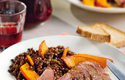 Linsensalat mit Kürbis und gebratener Entenbrust Zutaten 200 g Berg- oder Tellerlinsen 2 Schalotten 1 kleines Stück Ingwer (ca. 15 g) 4 EL Olivenöl 1/2 l Gemüsebrühe 1 große Saftorange 1/2 kleiner Hokkaido-Kürbis (ca. 400 g) 1 EL Rohrzucker 5 EL Apfelessig 1 EL flüssiger Honi [...]