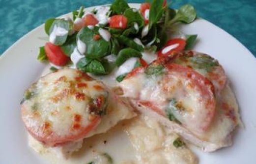 Zutaten für Personen Rezept mit Bild: Überbackenes Hähnchenfilet Caprese Bild einstellen 2 EL Olivenöl 3 Scheiben Hähnchenfilets Salz und Pfeffer 3 Scheiben Bacon-Scheiben 3 Romatomaten 80 gr. Felds [...]