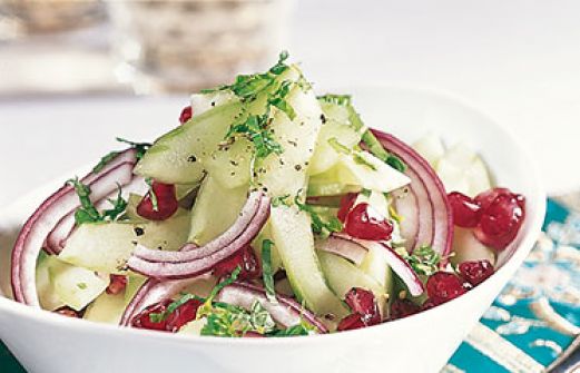 Gurkensalat mit Granatapfel Zutaten 1 großer Granatapfel 1 Salatgurke 1 rote oder milde weiße Zwiebel 1/2 Bund Minze (am besten Nana-Minze) 3 EL Zitronensaft Salz gemahlener Pfeffer 1 großer Granatapfel , 1 Salatgurke , 1 rote oder milde weiße Zwiebel , [...]