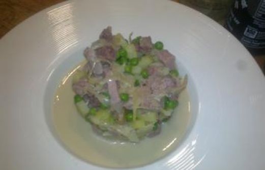 Zutaten für Personen Rezept mit Bild: Eisbein mit Sauerkrautsuppe Bild einstellen 1 Eisbein 4 kleine Kartoffeln 100 Gramm Erbsen 500 Gramm Sauerkraut 2 Schalotten 500 ml Sahne 100 ml Weißwein 0. [...]