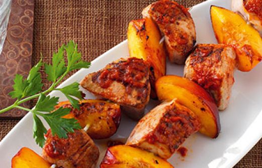 Schweinefiletspieße mit Nektarinen Zutaten 200 g Schweinefilet 2 Nektarinen 50 g mildes Ajvar (Paprikapüree) 50 ml Orangensaft 1/2 TL Currypulver 2 EL Tomatenmark 250 ml Gemüsebrühe 100 g Vollkornreis Jodsalz Pfeffer 2 EL Olivenöl 4 Fleischspieße 200 g Schweinef [...]