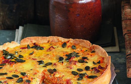 Kürbis-Tomaten-Quiche Zutaten 200 g Mehl 1 Ei (M) 5 EL Milch Salz 80  g eiskalte Butter Fett für die Form 500 g getr. Hülsenfrüchte zum Blindbacken 500  g Muskatkürbis 80  g getrocknete Tomaten (in Öl) 2 Zehen Knoblauch 150  g Crème fraîche 3 EL Milch 3 Eier (M) 150  [...]