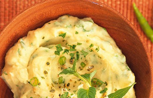 Kartoffelpüree mit Minze & Chili Zutaten 800 g mehlig kochende Kartoffeln Salz 300 ml heiße Milch 30 g Butter je 2 EL frisch gehackte Minze, glatte Petersilie und Koriandergrün 2-3 EL sehr fein gehackte grüne Chilischoten grüner Pfeffer aus der Mühle 800 g mehlig k [...]